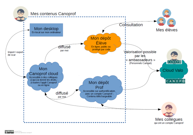 Canoprof est composé en 2 parties. Une partie desktop qui permet un travail en local. Une partie cloud personnelle qui permet le travail sur une ressource Canoprof en ligne ainsi que son partage.